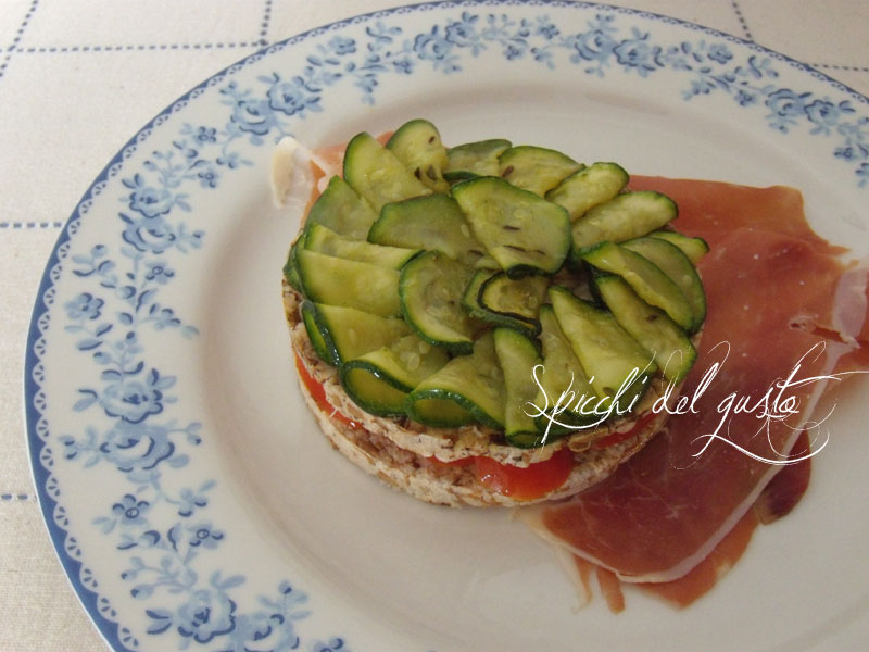 Per dimostrarvi la versatilità di questo prodotto ho realizzato un antipasto speciale con un carpaccio di zucchine marinate in olio, sale, limone e timo provenzale, all'interno dei pomodori tagliati a fettine condite con un pochino di sale e a rendere croccante l'antipasto, le gallette di Kamut Fiorentini alimenti, a completare il tutto un letto di buonissimo prosciutto crudo